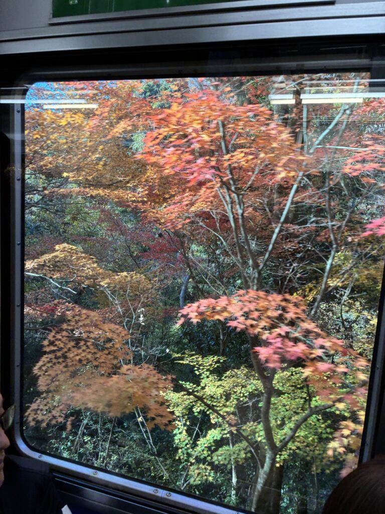 もみじが満開の場所は電車がゆっくり走ってくれた。