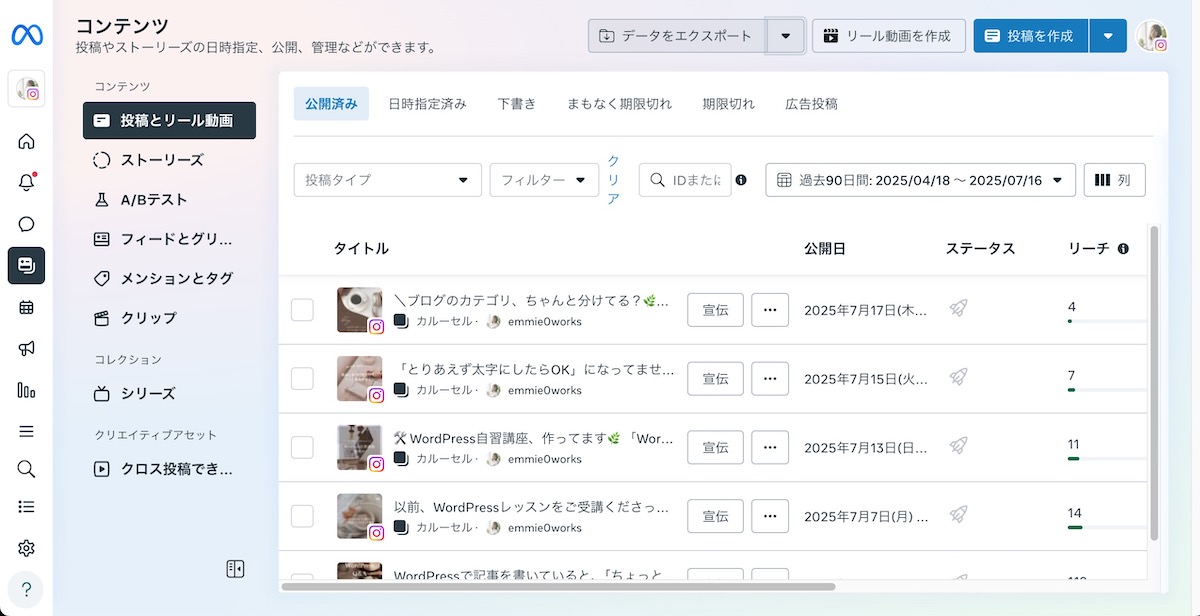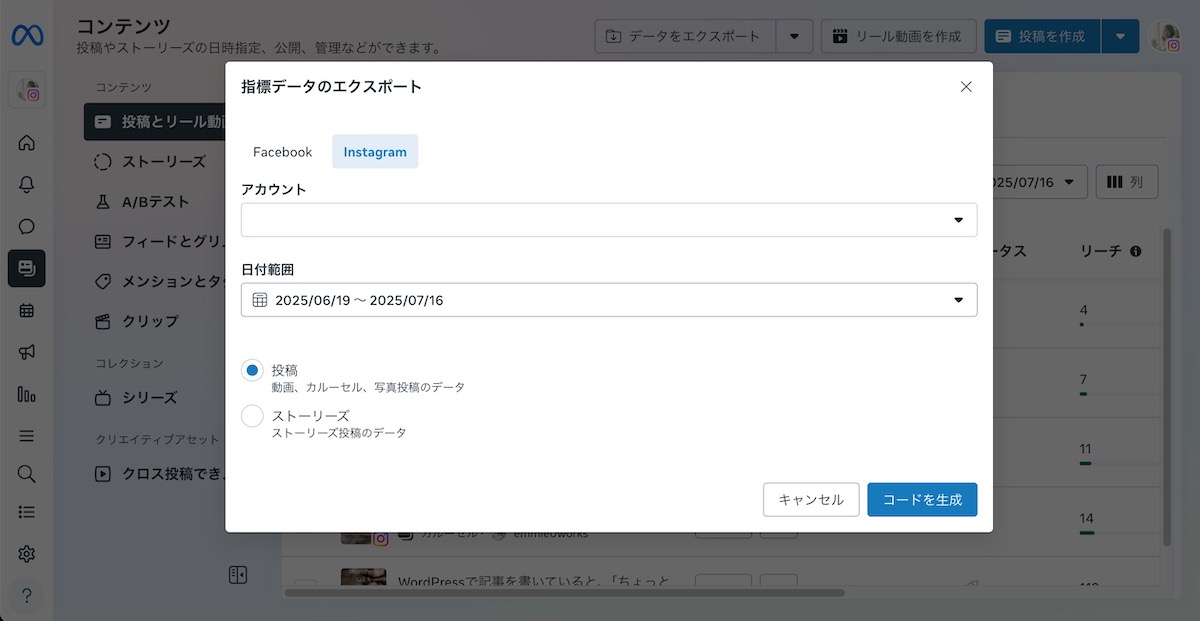 | 投稿タイプ | 「投稿タイプ」(例:ストーリー、リールなど) |